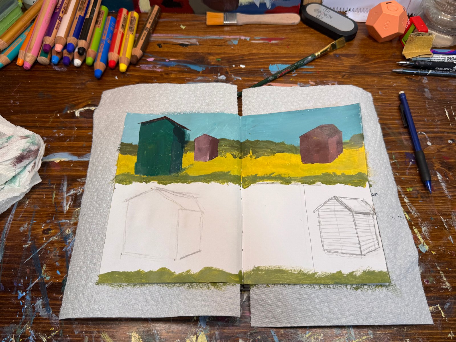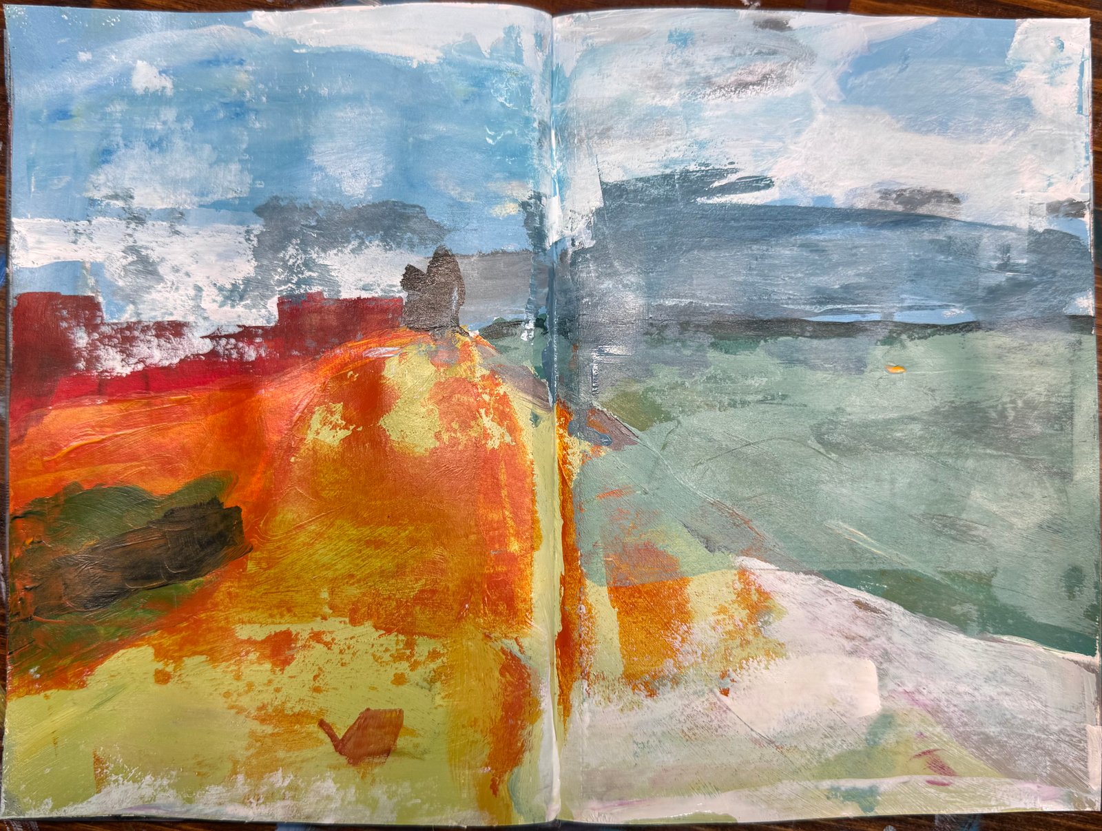 I keep telling myself I like abstract urban landscapes. That sounds right. But when I sit down to warm up in my journal, landscapes emerge—sometimes abstract, but not always urban. I’m not a landscape painter. Or am I? Sigh. Time will tell.